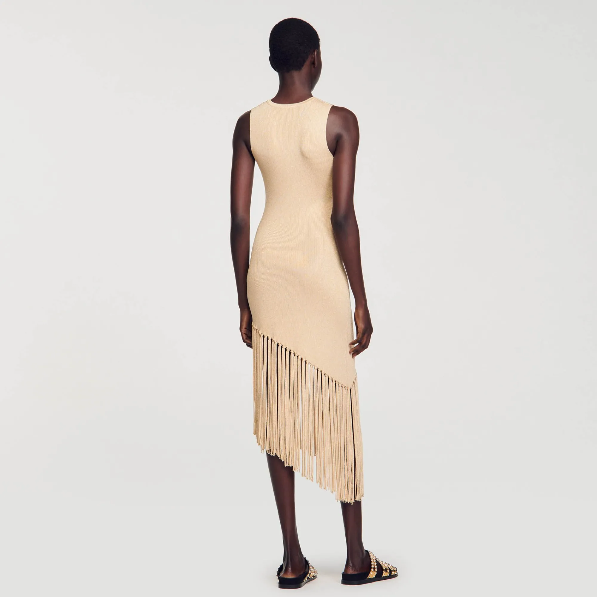 Vestido Longo De Malha Canelada, Sem Mangas, Com Decote Redondo E Decorado Com Franjas Assimétricas Na Bainha.