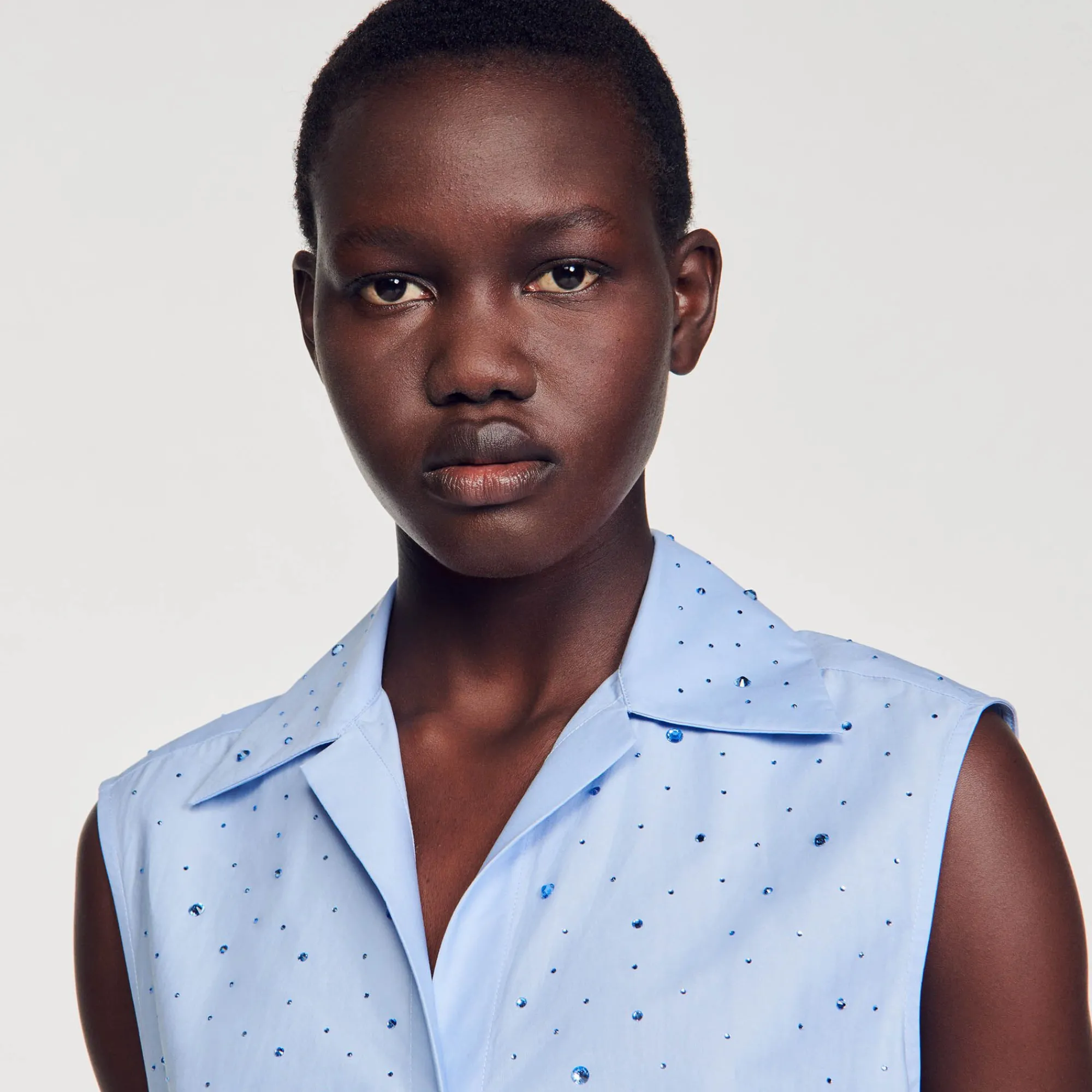 Vestido Longo Sem Mangas Com Gola De Camisa, Top Com Botões E Nó, Saia Larga Em Camadas E Detalhe De Strass Em Toda A Peça.